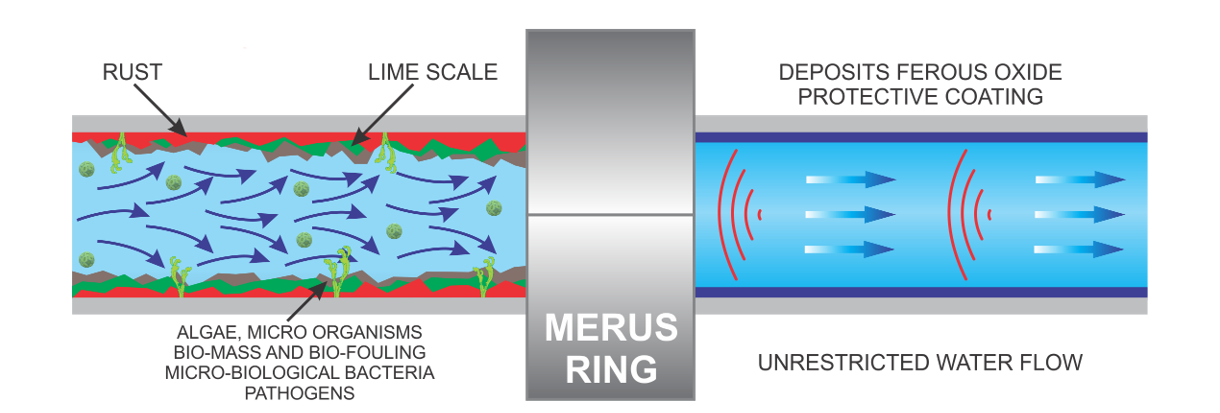 The Merus Ring emits programmed oscillations that disrupt mineral bonding in water. This physical effect helps reduce scale, rust, and biofilm – keeping your water systems clean and efficient.